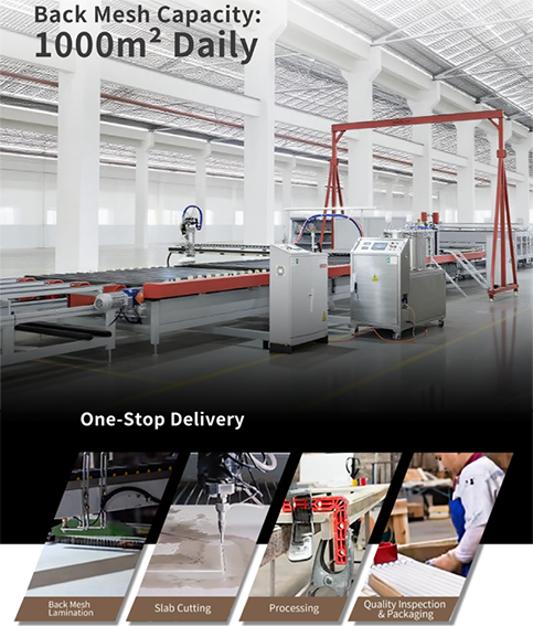 이 공정은 도자기 슬래브와 유리섬유 메쉬 사이의 강력한 접착력을 확보하는 동시에 슬래브의 치수 안정성을 유지하도록 설계되었습니다.