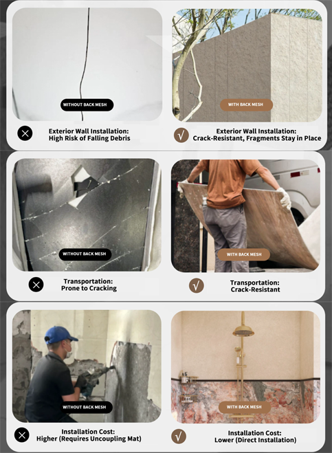 뒷면 메쉬 보강재는 절단, 취급, 운송 및 설치 중 파손 위험을 줄이는 데 도움이 됩니다.