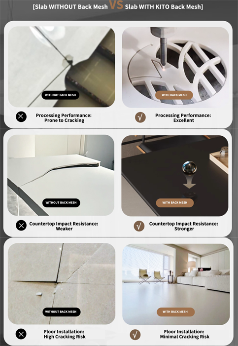 이러한 수요를 충족하기 위해 KITO CERAMICS는 이제 까다로운 용도에 필요한 추가적인 보강을 제공하는 전문적인 도자기 슬래브 후면 메쉬 라미네이션 서비스를 제공합니다.