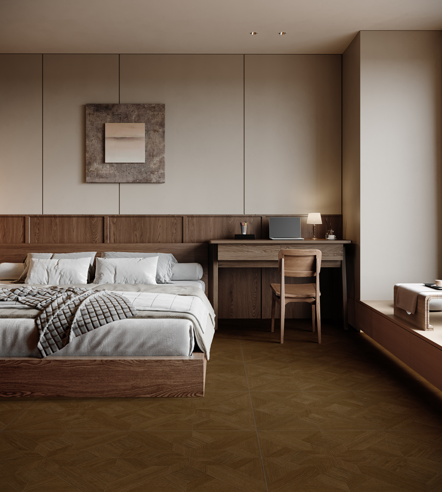 프로방스 가을 별장의 캐러멜빛 숲에서 영감을 받은 이 캐러멜 우드 바닥 타일 컬렉션은 자연스럽고 생생한 나뭇결에 정교하게 조각된 중국 매듭 패턴을 더해 자연의 아름다움과 세련된 장인 정신이 어우러진 분위기를 연출합니다.