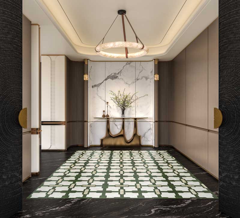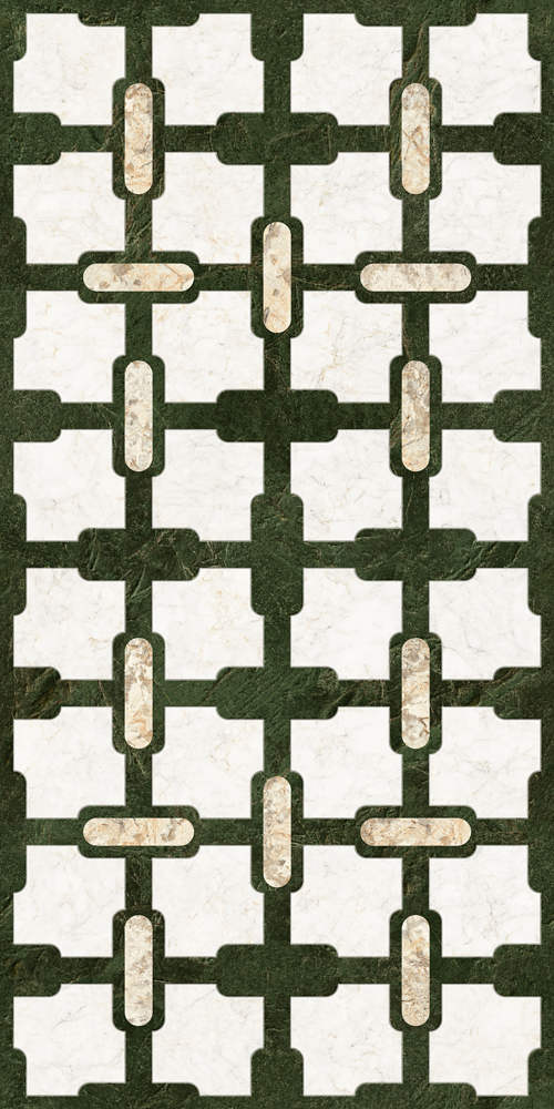 주된 짙은 녹색은 밝은 회색 천연석 무늬와 조화를 이루며, 부드러운 베이지색의 길쭉한 타원형 장식 블록으로 포인트를 더합니다. 이 모든 요소들이 어우러져 고전적인 중국 디자인의 색채 구성을 완성하는데, 이는 뚜렷한 대비를 이루면서도 조화로운 균형을 보여줍니다.