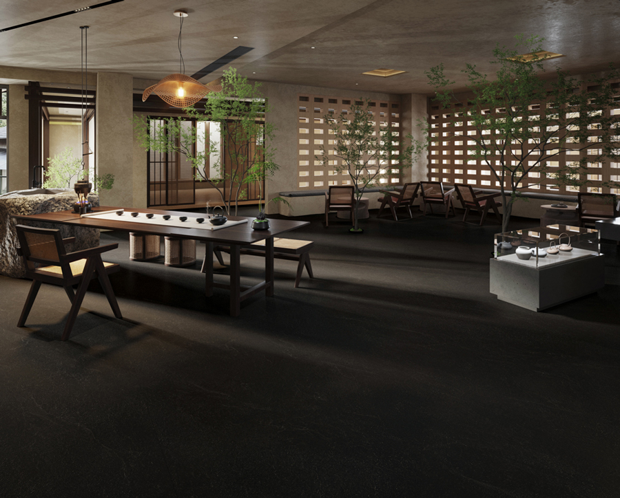 전체적인 분위기는 차분하고 내성적인 짙은 회색이며, 자연스러운 흰색 원석 질감이 짙거나 옅게 서서히 퍼져나가면서 신비로운 느낌을 자아내어 시각적으로 광활한 느낌을 선사합니다. 그 안에 있으면 마치 산 정상에 서서 저 멀리 펼쳐진 풍경을 바라보는 듯한 기분이 듭니다.